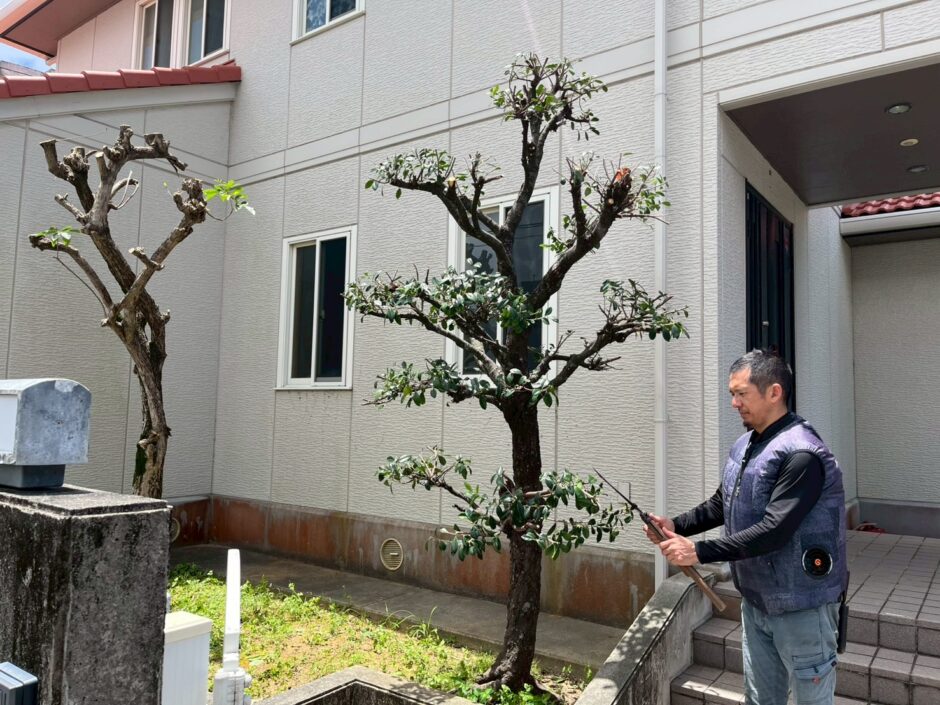 樹木は普段通り剪定して、フェンス側の樹木は目隠し木のため施主さんの要望の高さで剪定しました。